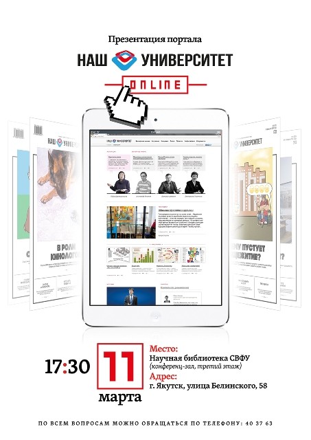 РИГ SAKHAPRESS.RU 11 марта 2014 года в Научной библиотеке Северо-Восточного федерального университета состоится презентация портала «Наш университет_ online». Редакция главного вуза республики существует уже почти 60 лет. 29 сентября 1956 года вышел первый номер газеты «Якутский университет». «ЯУшка», как ее тогда называли, послужила стартовой площадкой для многих журналистов и общественных деятелей республики. Накопив большой опыт и сохранив крепкие традиции, университетская редакция преобразилась и запускает новый формат развития. 11 марта СВФУ приглашает всех корреспондентов и редакторов, ранее работавших в редакции, чтобы представить новый медиапродукт − портал «Наш университет_ online». Главный редактор Редакции новостей СВФУ
