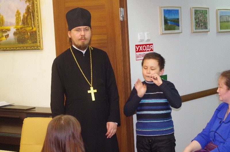 Никон рассказал о пасхальных традициях, обрядах и о воскрешении Иисуса Христа. Нужно отметить, что дети были очень увлечены историей святого отца, активно принимали участие и задавали интересные вопросы. Было неожиданностью торжественная поздравительная речь и виртуозная игра на хомусе ученика из школы слепых и слабослышащих второго класса