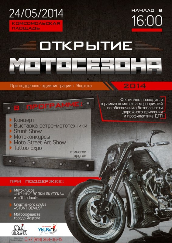 РИГ SAKHAPRESS.RU Открытие мотосезона в Якутске впервые будет отмечено масштабным фестивалем, который пройдет 24 мая с 16.00 часов на Комсомольской площади. С каждым годом в Якутске набирает обороты мотодвижение. Инициаторами организации этого первого фестиваля выступили мотоклубы "Ночные волки Якутска" и "Old school", спортивный клуб "Stunt devils" и мотосообщества города Якутска. Фестиваль проводится при поддержке администрации города Якутска в рамках комплекса мероприятий по обеспечению безопасности дорожного движения и профилактики ДТП. В программе фестиваля запланированы концерт, выставка ретро-техники, зрелищное мото-шоу – Stunt Show, мотоконкурсы, Moto Street Art Show, Tattoo Expo и многое другое.