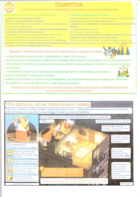 ПАМЯТКА НАСЕЛЕНИЮ по действиям при лесном пожаре: Ввиду начала пожароопасного сезона обращаем внимание на меры пожарной безопасности. В лесу недопустимо: пользоваться открытым огнем; выжигать траву под деревьями, на лесных полянах, прогалинах, а также стерню на полях, в лесу; разводить костры в хвойных молодняках, на торфяниках, лесосеках, в местах с сухой травой, под кронами деревьев, а также на участках поврежденного леса; употреблять на охоте пыжи из легковоспламеняющихся или тлеющих материалов; оставлять промасленный или пропитанный горючими веществами обтирочный материал; заправлять горючим баки двигателей, использовать неисправные машины, курить или пользоваться открытым огнем вблизи машин, заправляемых горючим; оставлять бутылки или осколки стекла, так как они способны сработать как зажигательные линзы. Виновные в нарушении этих правил несут дисциплинарную, административную или уголовную ответственность. Действия населения в зоне лесного пожара: окунитесь в ближайший водоем или накройтесь мокрой одеждой; для преодоления нехватки кислорода дышите через мокрый платок или смоченную одежду, пригнитесь к земле; определите направление ветра и распространение огня; выбрав маршрут выхода из леса в безопасное место, выходите только в наветренную сторону и вдоль фронта огня; приняв решение о тушении небольшого пожара, пошлите за помощью в населенный пункт; при небольшом пожаре заливайте огонь водой из ближайшего водоема, сметайте пламя 1,5-2 м пучком из веток лиственных деревьев, мокрой одеждой, плотной тканью; небольшой огонь на земле затаптывайте, не давайте ему перекинуться на деревья, не уходите, пока не убедитесь, что огонь потушен.