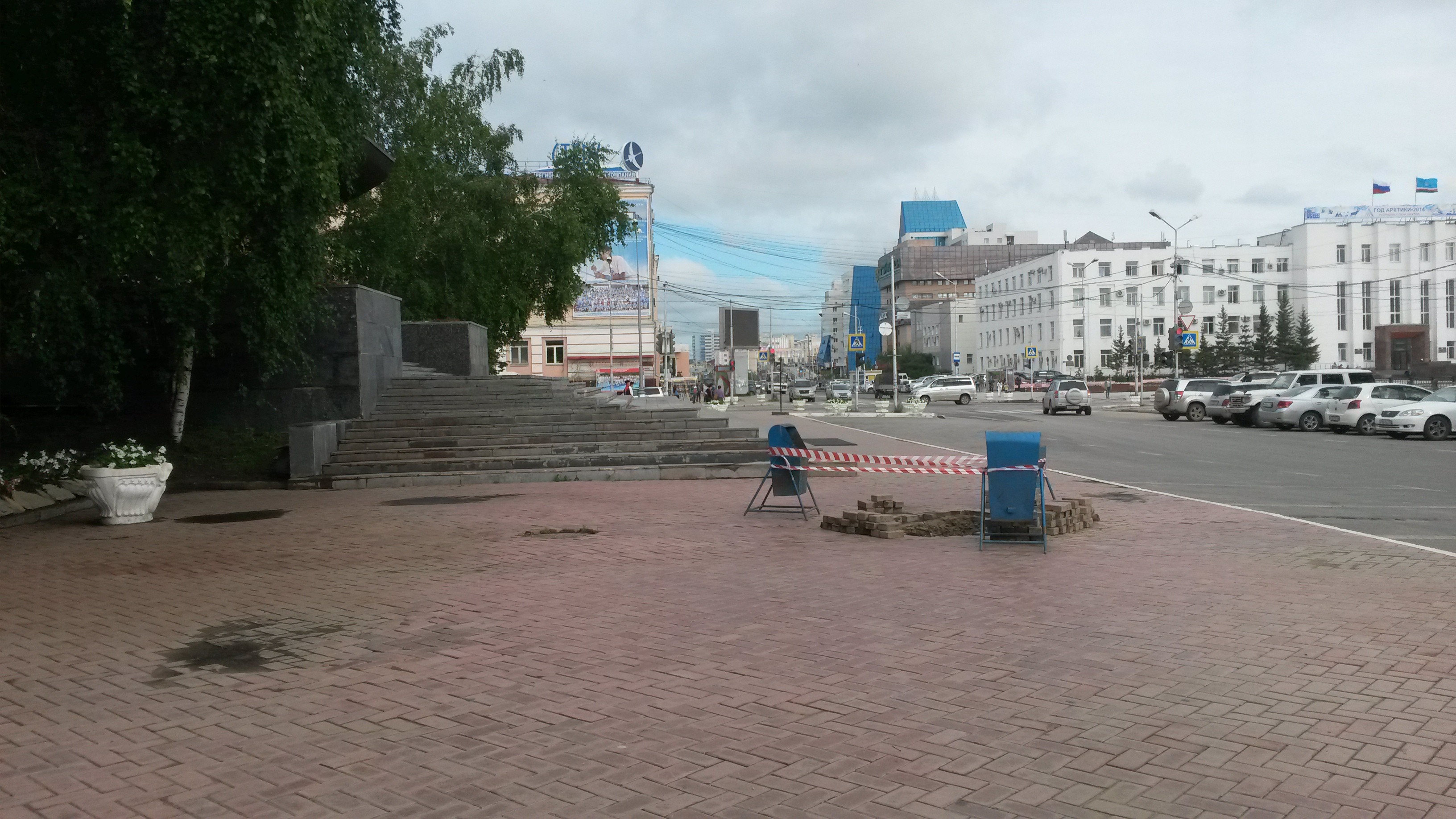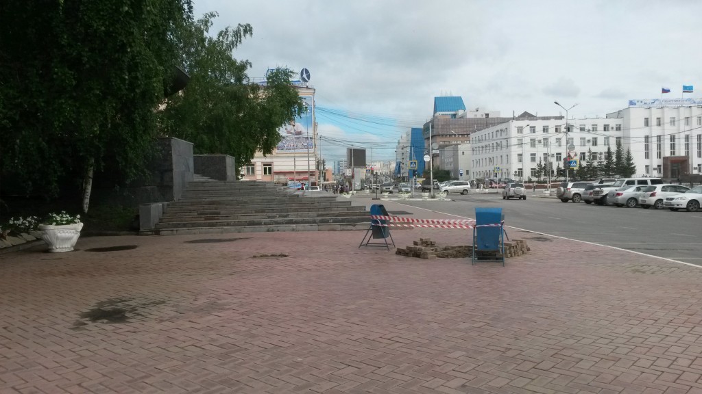 РИГ SAKHAPRESS.RU В конце прошлой недели прямо перед крыльцом Дома правительства №1 провалилась земля. На месте провала образовалась большая дыра. Со вчерашнего дня начались ремонтные работы. Как видно на фото, яму даже "обозначили" специальной заградительной лентой, которую обмотали вокруг... трех мусорных урн. Оригинально! Александр ЕГОРОВ. Фото автора. РИГ SAKHAPRESS.RU