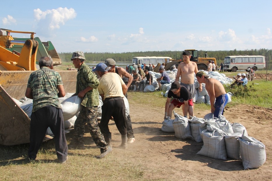 РИГ SAKHAPRESS.RU После промыва коренного берега с западной стороны водохранилища «Сирэ-Хологос» и выхода воды в пойму реки Татта возникла реальная угроза подтопления 11 населенных пунктов Чурапчинского и Таттинского улусов республики. В ночь на 12 июля произошло подтопление села Ожулун, в результате которого в зоне подтопления оказались 114 дворовых территорий, в которых проживает 405 человек. Все жители были заблаговременно эвакуированы, однако селу нанесен серьезный материальный ущерб. В связи возникшей угрозой 11 июля 2014 года вышел Указ временно исполняющего обязанности Главы Республики Саха (Якутия) об объявлении режима чрезвычайной ситуации на территории Чурапчинского и Таттинского улусов. Во исполнение положений данного Указа по состоянию на утро 15 июля 2014 года в зоне чрезвычайной ситуации проведены следующие работы: - На гидротехническом сооружении «Сирэ-Хологос» проведены работы по укреплению плотины дамбы 1.500 мешками с песком силами местных жителей и сотрудников ГУ МЧС России по РС(Я). - В районе села Ожулун Чурапчинского района выполнена укладка вдоль берега реки Татта 1600 мешков с песком. - На гидротехническом сооружении «Лампа» с помощью техники устроены земляные перемычки на низких участках. - На гидротехническом сооружении «Бере» проводились работы по расширению естественного водосброса. - Силами населения села Харбала-1 и спасателей МЧС России в качестве превентивных мероприятий проведены берегоукрепительные работы на правой стороне коренного берега дамбы, укреплено 350 м дамбы. Уложено 6.000 мешков с песком, с нарастающим итогом уложено 7.500 мешков. -В селе Чурапча проводятся работы по укреплению дамбы «Харылах». - Организована работа по укреплению тела дамбы на гидротехническом сооружении «Ытык-Кюель» с помощью 3 бульдозеров, 2 экскаваторов, 2 погрузчиков, 1 грейдера, 12 самосвалов «Камаз» и 1 автотрала. Техника предоставлена ОАО «ТаттаАвтодор». Отсыпано 6 410 м. куб. грунта. План 12 000 куб. м. - На республиканской автодороге «Ытык-Кюель – Харбалах - Чичимах» 13 км участка ведутся восстановительные работы. Работают: 5 единиц техники в том числе 1 кран. 3 скрепера МОАЗ. 1 бульдозер Т-100. - На гидротехническом сооружении «Харбала 2» проводились работы по созданию запаса грунта на случай необходимости укрепления плотины дамбы с помощью 10 самосвалов «Камаз». Приготовлено 140 тн грунта. Техника предоставлена администрацией МО «Чурапчинский район». - На участке 264 км – 190 км ведется засыпка. Всего работают: 4 автомашины Камаз, 2 бульдозера, 1 экскаватор, 1 грейдер, 1 погрузчик. - ИП Охлопковым начаты работы по усилению дамбы «Чэрэтэк» в селе Кыйы. Всего работают 5 единиц техники. - В местности «Хамынньыкы» начаты работы по отводу воды из реки Таатта. Всего работают 5 единиц техники. - Ниже села Ытык-Кюель ведутся работы по расчистке реки Таатта от кустарника, мелколесья. Всего работают 3 единиц техники. - Служба спасения Республики Саха (Якутия) доставила в пострадавшее от подтопления село Ожулун 5 мотопомп для откачки воды из низменных мест и 14 тепловых пушек для просушки домов.