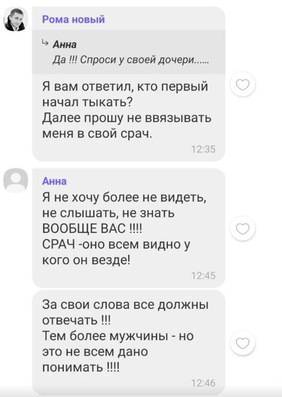 «Вопрос надо решать, а не сопли жевать», - заявил Роман. «Сам ты сопли жрешь!» - ответила Анна в голосовом сообщении. Далее родители стали выяснять, кто из них первым перешел на ты. «За свои слова все должны отвечать!!! Тем более мужчины - но это не всем дано понимать!!!!» - предупреждает Анна.