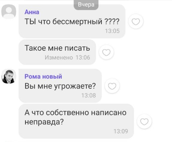 После этого Анна окончательно выходит из себя и начинает угрожать. «Ты что бессмертный ???? Такое мне писать », - спрашивает женщина. «Вы мне угрожаете? - удивляется Роман. - А что, собственно, написано неправда? »