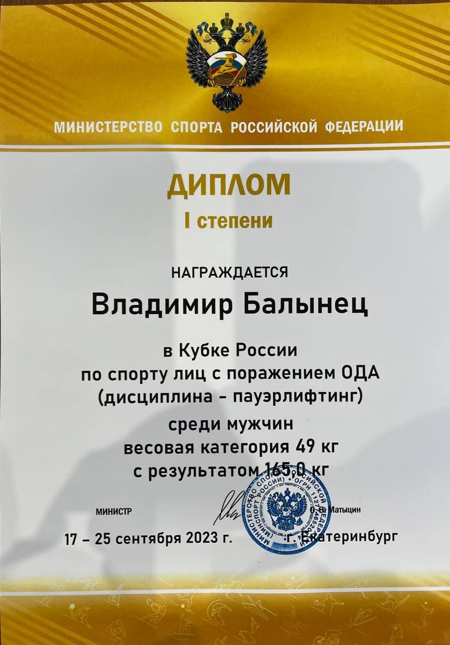 Владимир Балынец в дисциплине пауэрлифтинг награжден дипломом 1 степени с результатом 165,0 кг среди мужчин в весовой категории 49 кг.