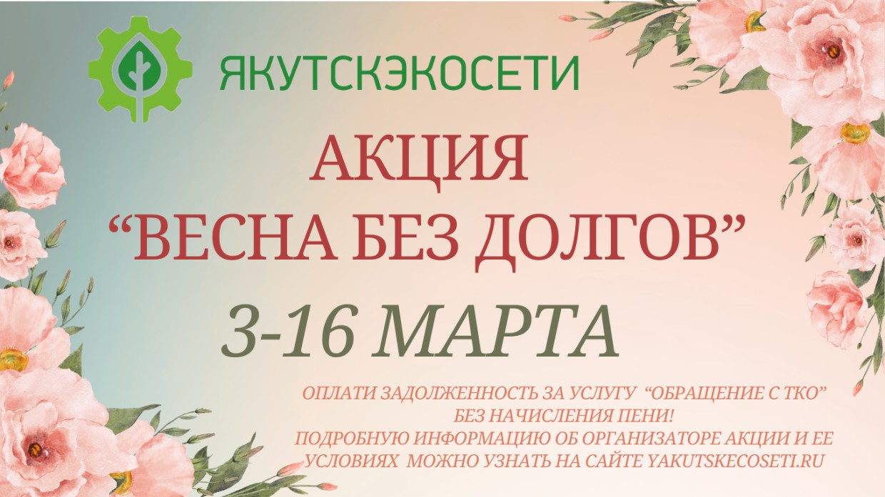 Региональный оператор «Якутскэкосети» поздравляет всех с наступлением весны и прекрасных женщин с Международным женским днем! В честь этого замечательного времени года мы запускаем акцию для потребителей, имеющих задолженность за услугу «Обращение с ТКО».