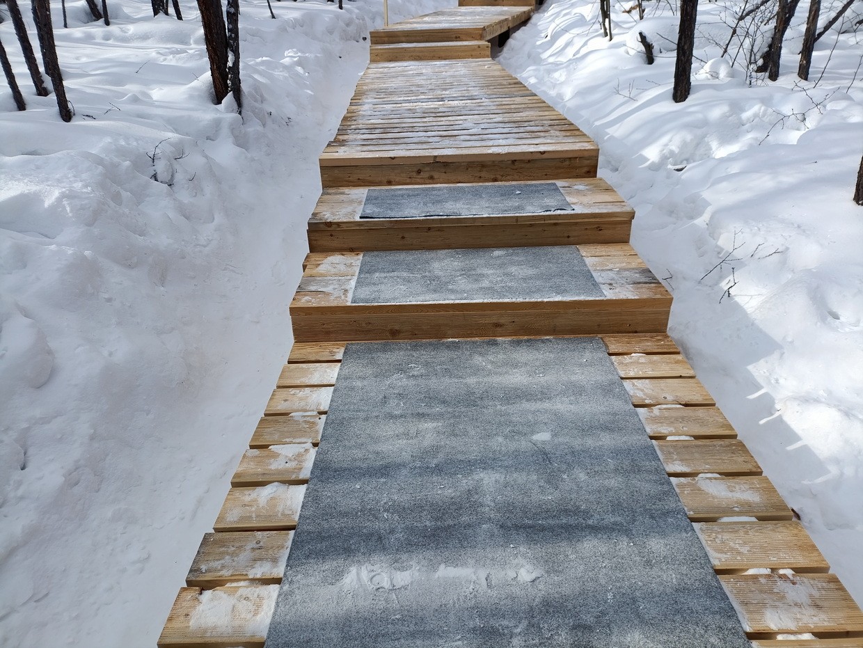 На особо скользких участках постелили ковролин, но в обуви с войлочной подошвой будет тяжело спускаться, она замерзает и тропа превращается в каток. Я в валенках с резиновой подошвой обратно шла легко, а подруга в унтах раз пять падала, хотя я держала ее как могла. Ей не понравилось, что не везде есть перила. К слову, после многочисленных жалоб посетителей Министерство предпринимательства и туризма заверило, что примут дополнительные меры для безопасности туристов.
