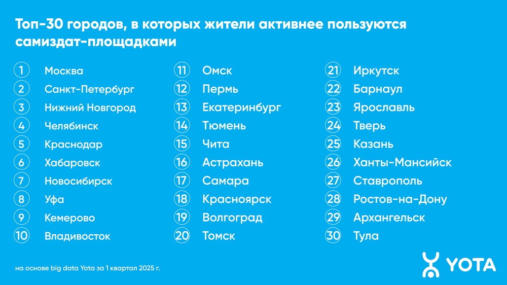 Россияне всё активнее читают произведения начинающих авторов на самиздат-площадках — число пользователей таких сервисов за год выросло на 37%, а время, проведённое на этих ресурсах, увеличилось на 24%. При этом в Якутии книголюбы на 67% чаще стали заходить на самиздат-платформы. К такому выводу пришли аналитики Yota на основе обезличенных данных за первый квартал 2024 и 2025 годов.