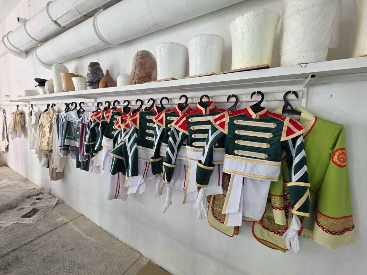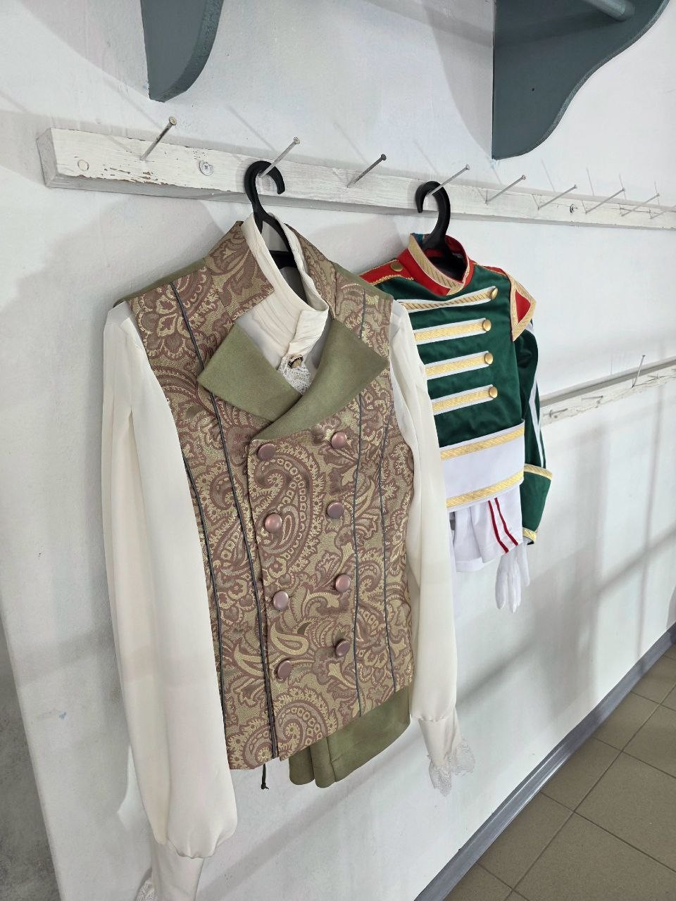 Какие костюмы у нее получились — предстоит оценить маленьким зрителям. А это очень сказочная, практически кукольная одёжка: шикарные гусарские мундиры, расшитые золочёными шнурами — для маленьких солдатиков храброго Щелкунчика. Серые солдатские мундиры — для огромного мышиного войска, превосходящей куколок по количеству, по силе и наглости.