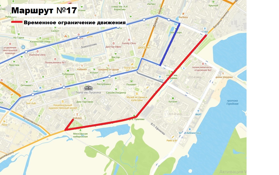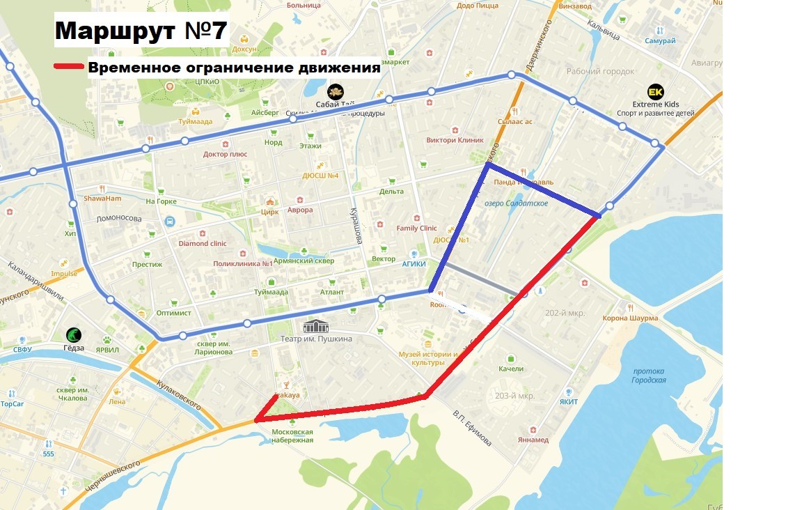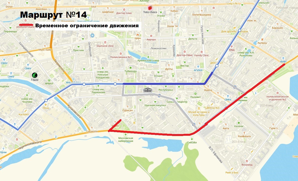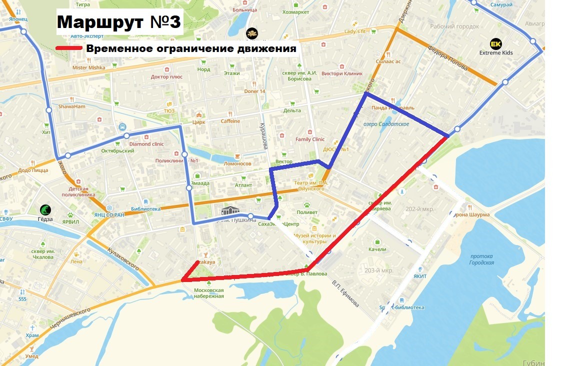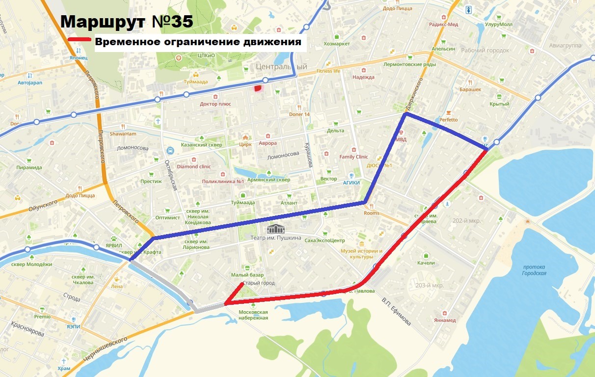 Окружная администрация города Якутска информирует, что с 11:30 по 14:00 часов 6 мая 2025 года движение транспорта по ул. Аржакова от церкви до ул. Чернышевского, ул. Чернышевского, ул. Хабарова до пл. Победы будет полностью закрыто. Данное перекрытие организовано в целях организации мероприятия «Крестный ход» и обеспечения безопасности дорожного движения. Городской общественный транспорт будет следовать по следующим схемам объезда (см. фото).