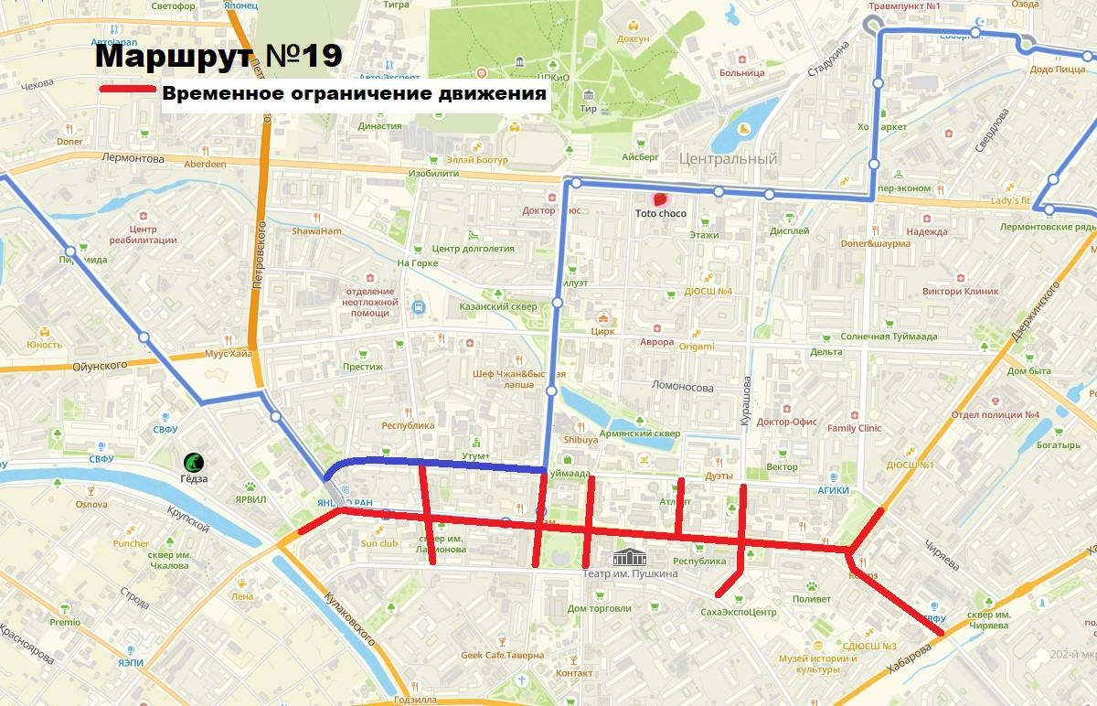 - ул. Октябрьская, Кирова, Аммосова, Курашова (от Орджоникидзе до Ярославского);