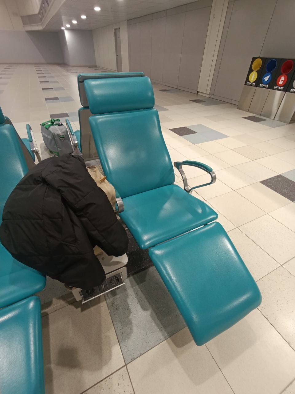 Никто ничего не знал, стала пропадать мобильная связь, толкотня у стоек представителей S7 ничего не дала (они даже пассажирам с маленькими детьми и людям с ограниченными возможностями не могли предоставить гостиницу, хотя бы с питанием проблем не было). Эконом и бизнес-залы ожидания забиты под завязку. Наш рейс стабильно переносили ровно на два часа — не было возможности ни капсульный отель заказать, ни выехать с аэропорта. Я первое время каждые два часа бежала к стойке, затем устала, нашла тихий уголок в аэропорту, завернулась в куртку и легла спать, проверяя каждые 1,5 часа в ТГ-канале — сняли режим «Ковер» или нет.