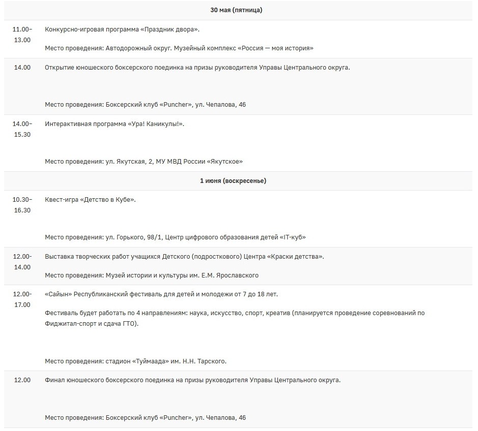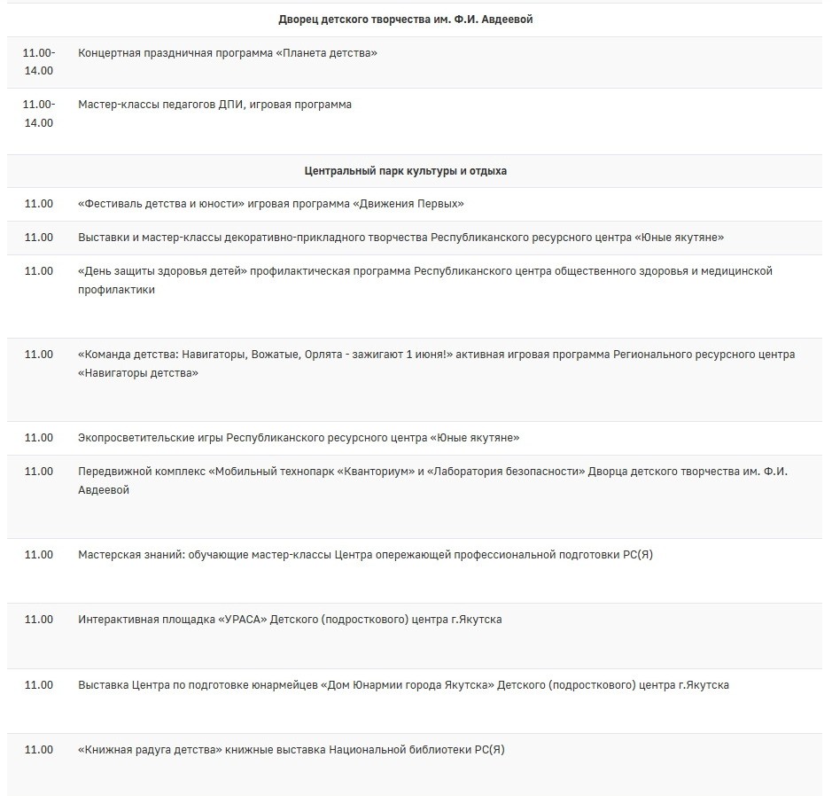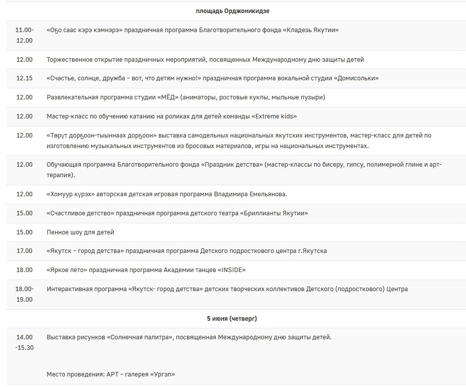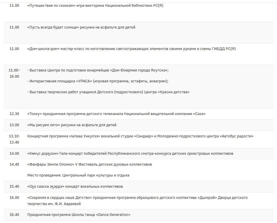 Программа праздничных мероприятий, посвященных Международному дню защиты детей в городском округе «город Якутск»