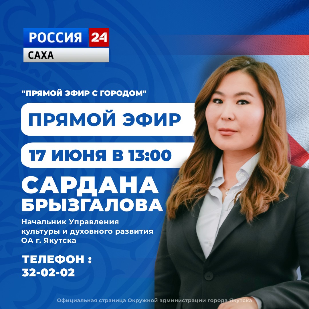 17 июня начальник Управления культуры и духовного развития Окружной администрации города Якутска Сардана Брызгалова примет участие в программе «Прямой эфир с городом» на телеканале «Россия 24». Прямой эфир также можно посмотреть на сайте ГТРК «Саха» gtrksakha.ru. Начало в 13 часов.