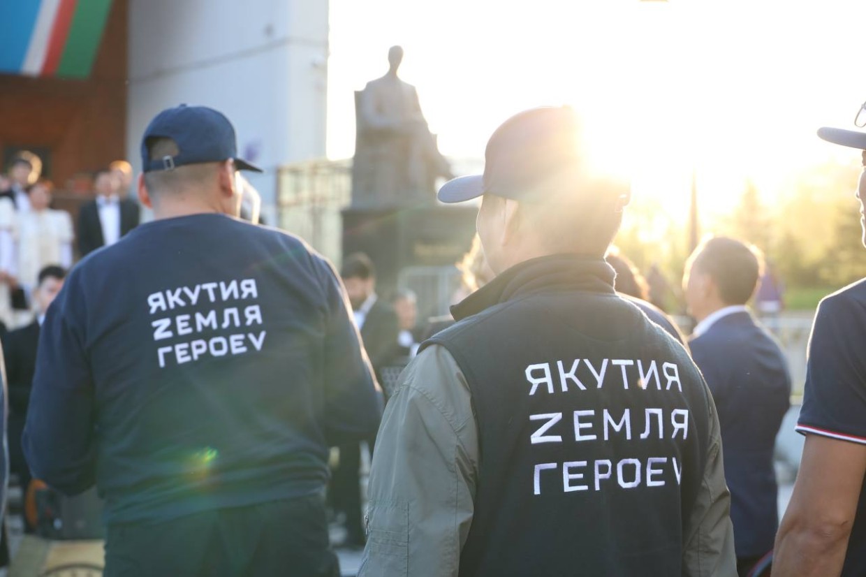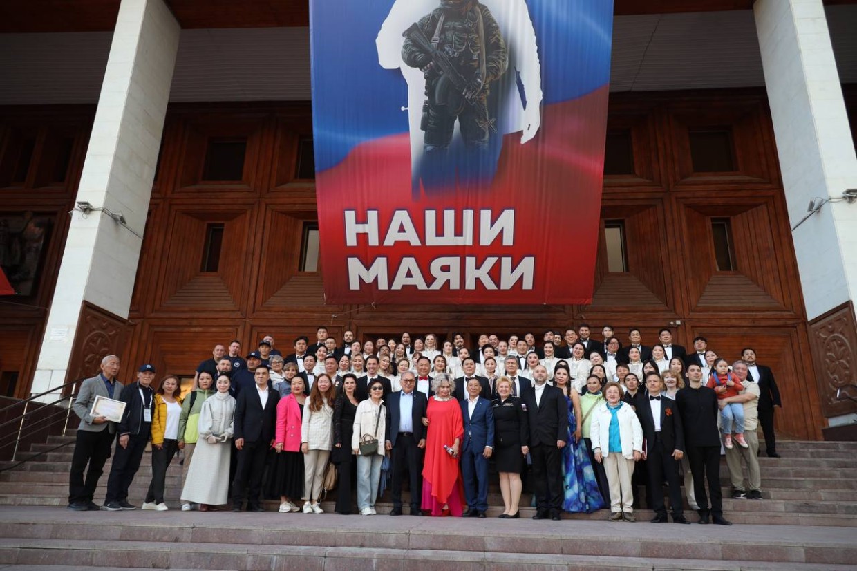 Собравшиеся — зрители и артисты — стоя приветствовали и аплодировали участников СВО: Филиппа Евсеева, Андрея Григорьева, родных и близких Героев России Алексея Неустроева и Петра Киприянова, участников регионального кадрового образовательного проекта «Якутия — Земля Героев».