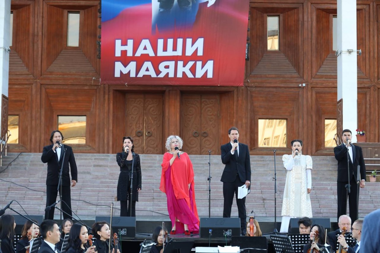 В рамках акции «Наши маяки» была подготовлена интересная программа, которую Театр Армии представил зрителям совместно с артистами якутского театра — хора, балета, оркестра и солистами оперы. Ну а начали концерт легендарной песней Булата Окуджавы из фильма «Белорусский вокзал» «Нам нужна одна победа» народная артистка России Ольга Богданова, Тимур Еремеев, Жанетта Гурская и артисты якутского театра оперы и балета Василий Пинигин, Галина Малышева и Олег Беляев.