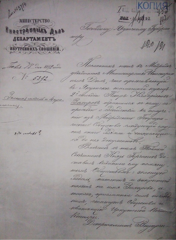 14 октября 1892 г. № 3126 отношение исполняющего обязанности Якутского губернатора в «Департамент внутренних сношений» МИД о направлении расписки купца 2-й гильдии П.И. Захарова в том, что он получил золотую медаль и полагающиеся к ней документы Мадридского географического общества: