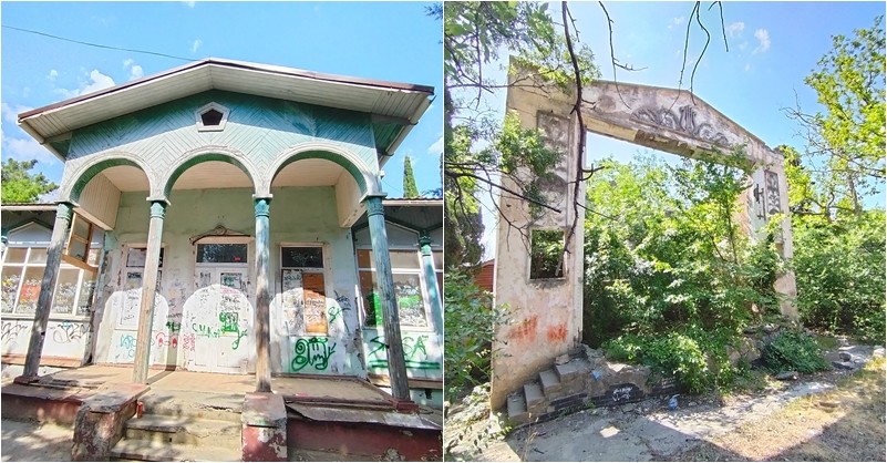 Новое обретение Якутии – дар главы Республики Крым – уже застолблено вывеской о принадлежности объекта при входе на территорию. А далее по тропинке всё внутреннее пространство напоминает картины разорённого дворянского гнезда: заросшая суетливой южной растительностью вычурная арка летнего театра, опять же гипсовые фигурки детишек, радующихся светлому будущему и расписанный местной шпаной заброшенный корпус санатория.