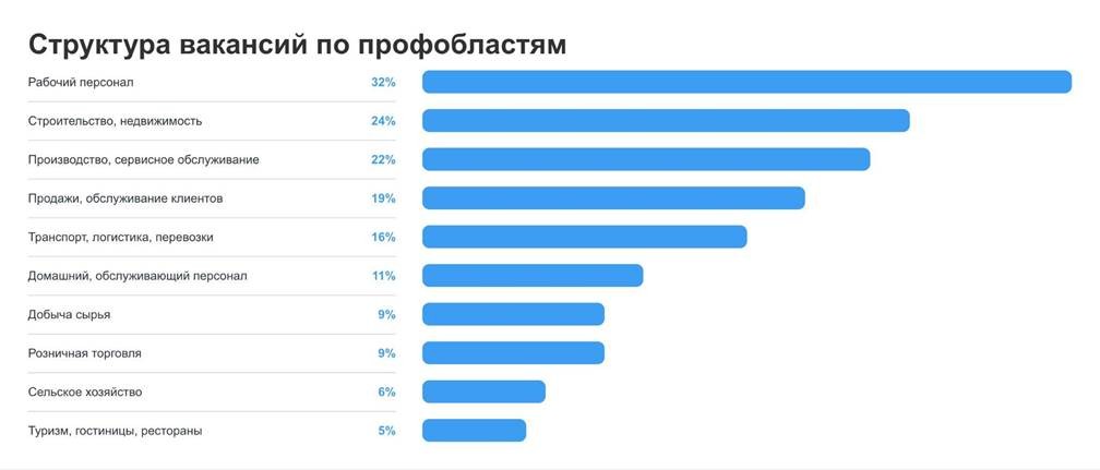 По итогам июня работодатели открыли или обновили в Якутии 3,4 тысяч вакансий. Больше всего рабочих мест сосредоточено в сфере рабочего персонала — здесь компании открыли 1 тыс. вакансий, или 32% от всего объема предложений о работе в регионе. Далее следует сфера строительства, недвижимости — там открыто 808 или 24% вакансий. На третьем месте по объему спроса — производства и сервисного обслуживания. Здесь сосредоточено 735 или 22% вакансий. На четвертом месте по востребованности этим летом — работники из сферы продаж, обслуживания клиентов (648 или 19% вакансий), замыкают пятерку наиболее востребованных — специалисты из транспортно-логистической сферы (546 или 16%).