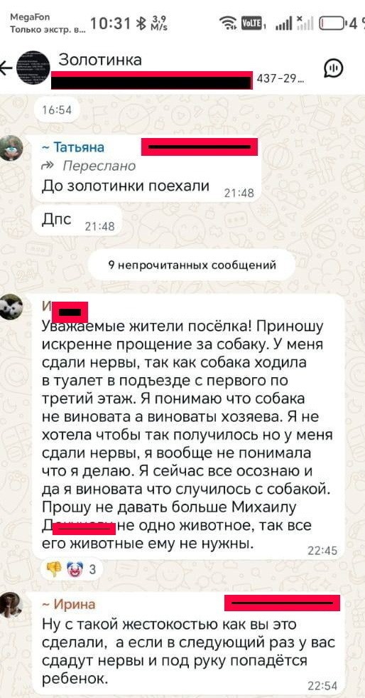 "Уважаемые жители поселка, приношу искренне извинение за собаку. У меня сдали нервы, так как она ходила в туалет в подъезде с первого по третий этажи. Я понимаю, что собака не виновата, а виноваты хозяева. Я не хотела, чтобы так получилось, но у меня сдали нервы. Я вообще не понимала, что делаю.