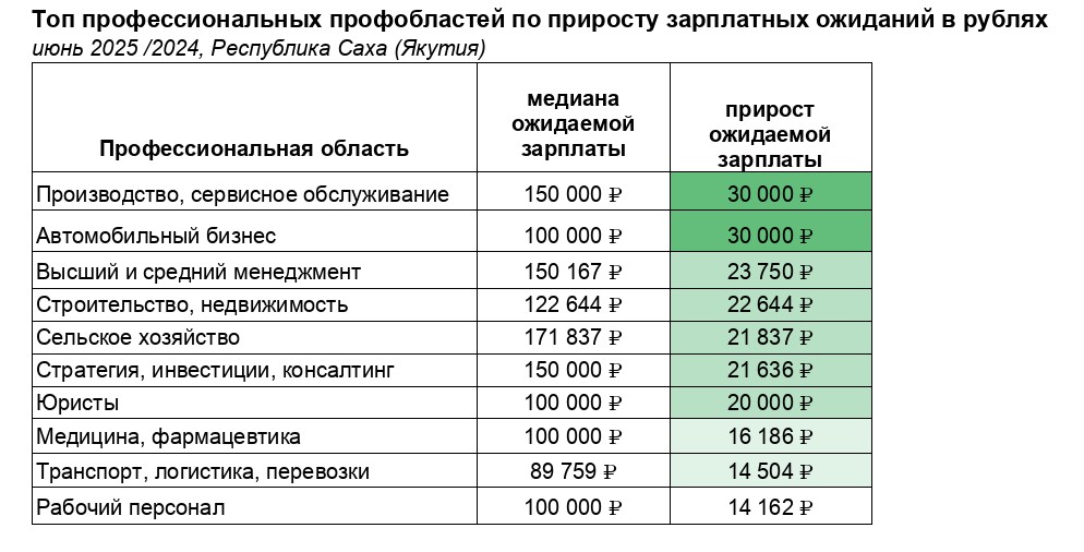 В рублях заметнее всего в Якутии выросли желаемые заработные платы у специалистов из направлений «Автомобильный бизнес» (+30 тыс. руб. в июне 2025 к июню 2024, до 100 тыс. руб.), «Производство, сервисное обслуживание» (+30 тыс. руб., до 150 тыс. руб.), «Высший и средний менеджмент» (+23,8 тыс. руб., до 150,2 тыс. руб.), «Строительство, недвижимость» (+22,6 тыс. руб., до 122,6 тыс. руб.), «Сельское хозяйство» (+21,8 тыс. руб., до 171,8 тыс. руб.), «Стратегия, инвестиции, консалтинг» (+21,6 тыс. руб., до 150 тыс. руб.), «Юристы» (+20 тыс. руб., до 100 тыс. руб.), «Медицина, фармацевтика» (+16,2 тыс. руб., до 100 тыс. руб.), «Транспорт, логистика, перевозки» (+14,5 тыс. руб., до 89,8 тыс. руб.), «Рабочий персонал» (+14,2 тыс. руб., до 100 тыс. руб.).