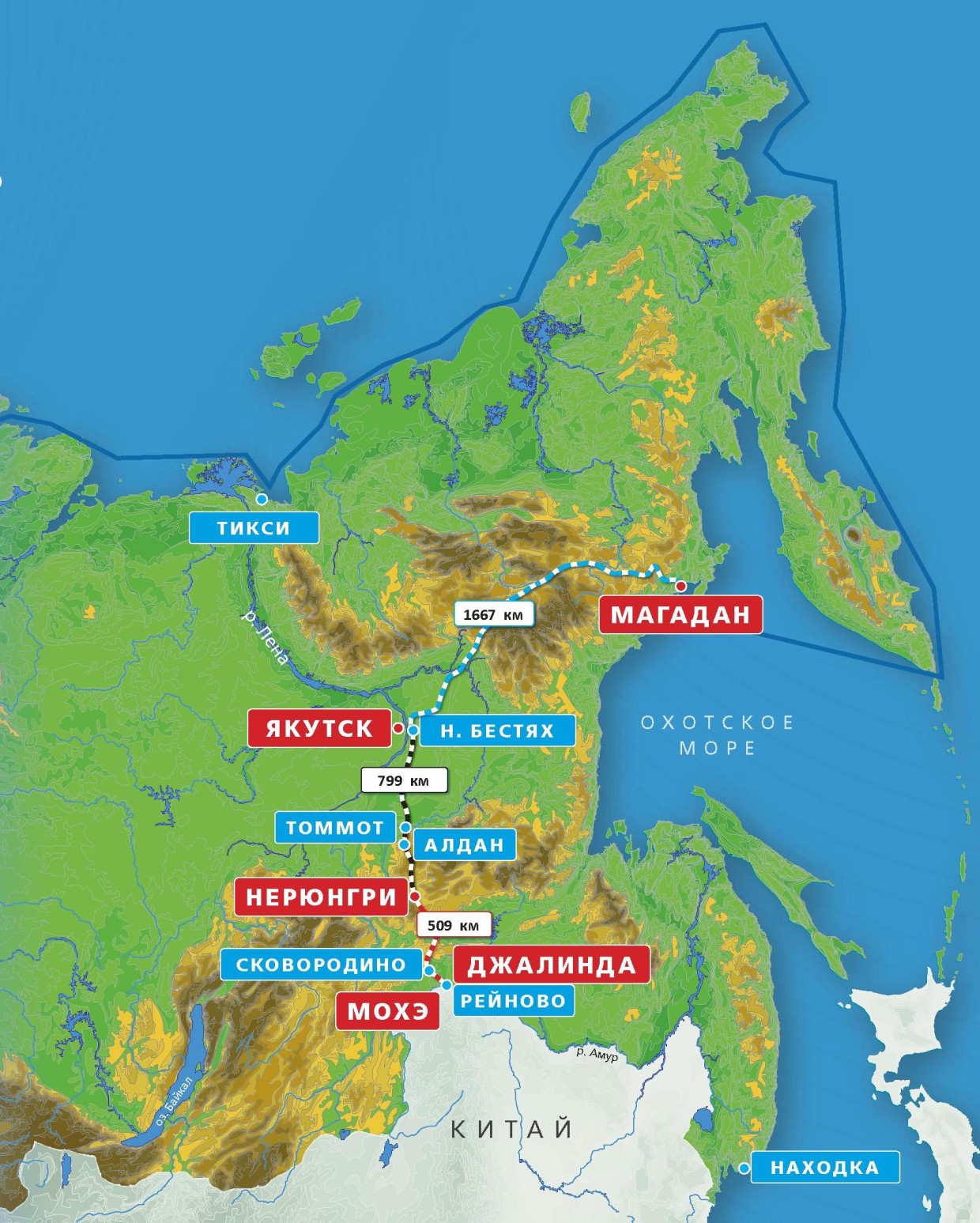 По его словам, еще одним важным проектом для создания Северо-Восточного коридора является строительство железной дороги Нижний Бестях – Магадан, реализовать который планируется в три этапа. Первый этап соединит Нижний Бестях с Хандыгой. Там же проложат автомобильно-железнодорожные мосты общей протяженностью более двух километров. Второй этап проляжет до города Сусуман в Магаданской области. Третий этап пройдет от Сусумана до Магадана.
