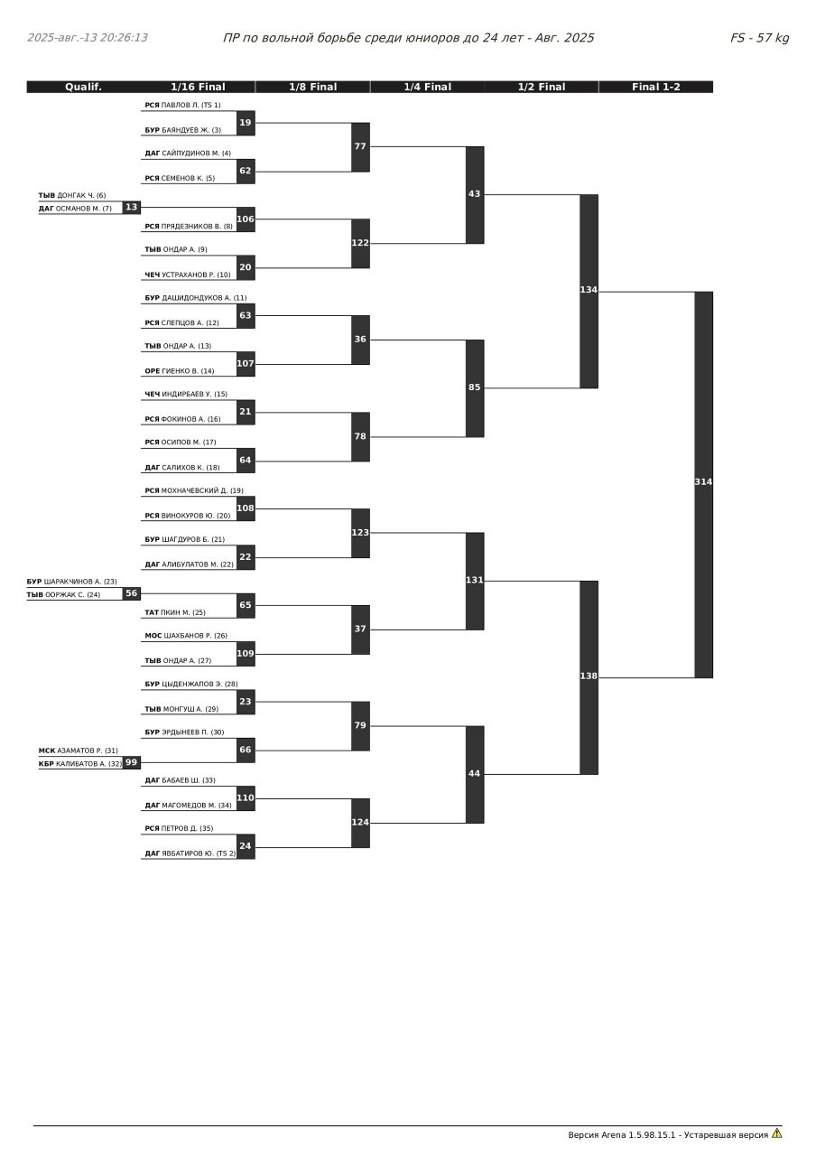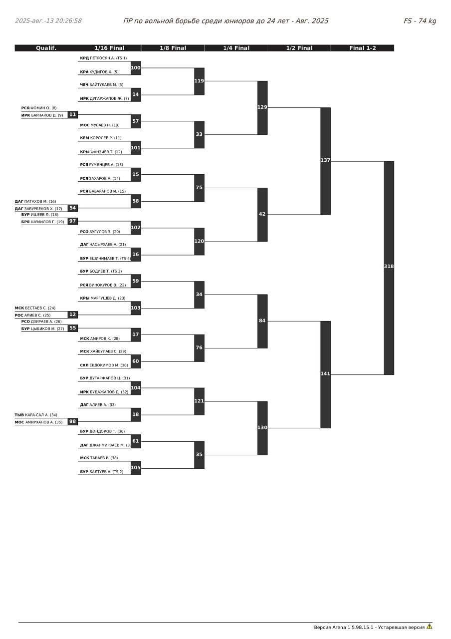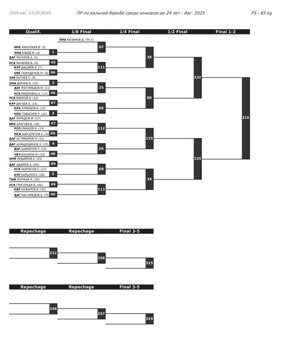 Двоим якутским борцам в стартовом поединке нужно будет бороться с дагестанцами. Так, в весе до 65 кг (31 участник) бронзовый призер чемпионата России Виктор Яковлева выйдет против чемпиона СКФО Абдурахмана Расулова, а победитель юниорского первенства Европы Андрей Мидловец - против Магомедарифа Магомедова. В этом же весе победитель Спартакиады молодежи России Василий Григорьев будет бороться с тувинцев Кежиком Ооржак.