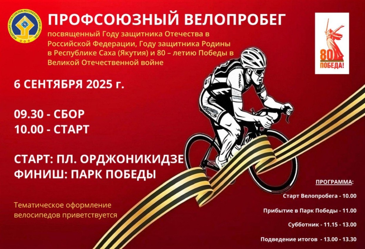 Друзья, коллеги и все любители активного отдыха! Федерация профсоюзов Якутии приглашает на ежегодный Профсоюзный велопробег, который в этом году посвящен особым датам: