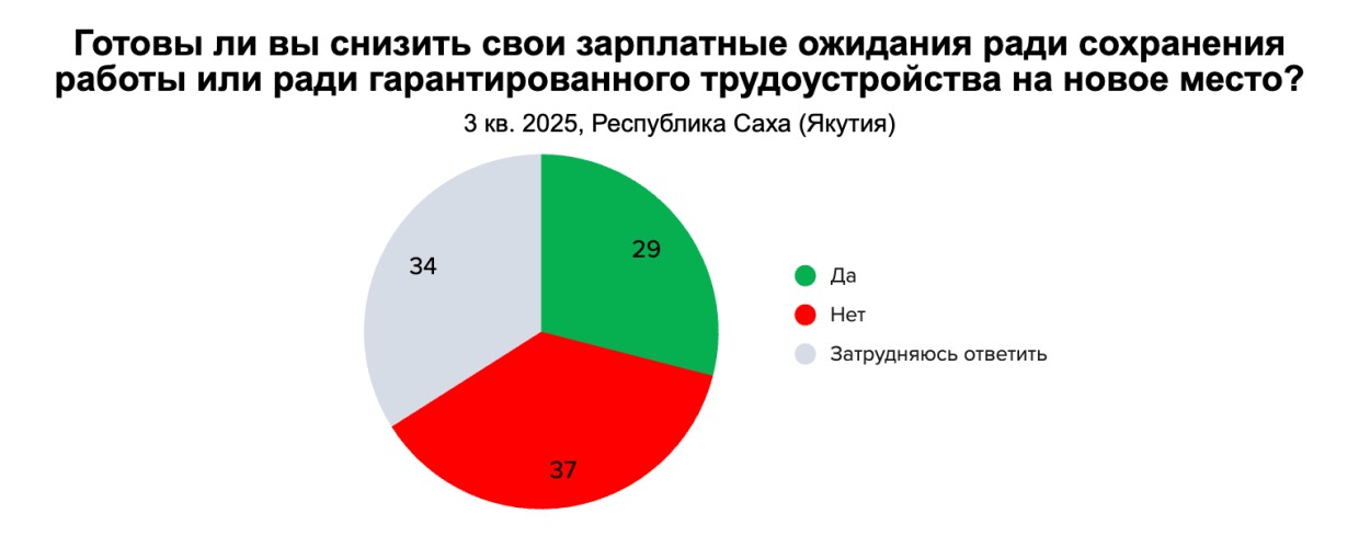 Результаты традиционного среза настроений соискателей, который ежеквартально проводит российская платформа онлайн-рекрутинга hh.ru, говорят о том, что больше трети работающих жителей Республики Саха (Якутия) в третьем квартале 2025 года не готовы снижать зарплатные ожидания, даже если уступки позволят им быстрее найти работу. Однако, это касается не всех специалистов.
