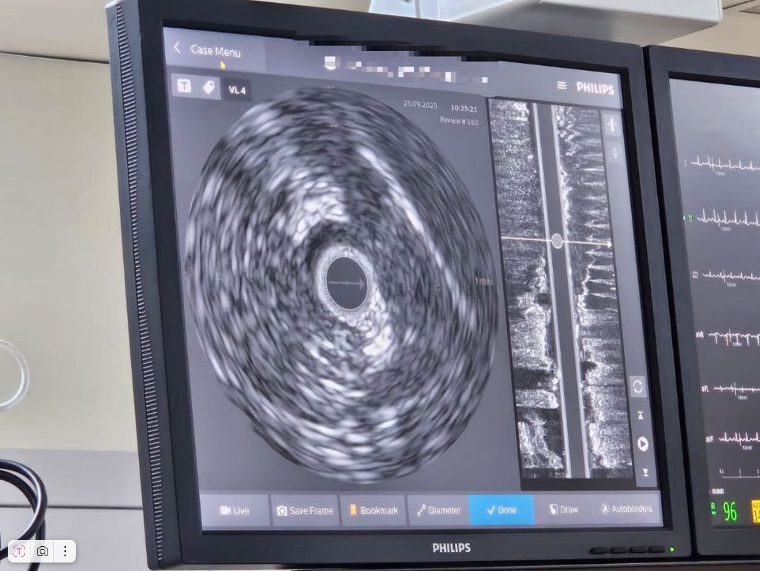 Получив ультразвуковое изображение сосуда, врачи определили места для установки стента, а также минимальные и максимальные диаметры сосуда. Затем была произведена точная имплантация стента с лекарственным покрытием. После установки стента было проведено контрольное внутрисосудистое ультразвуковое исследование, которое позволило оптимизировать его положение.