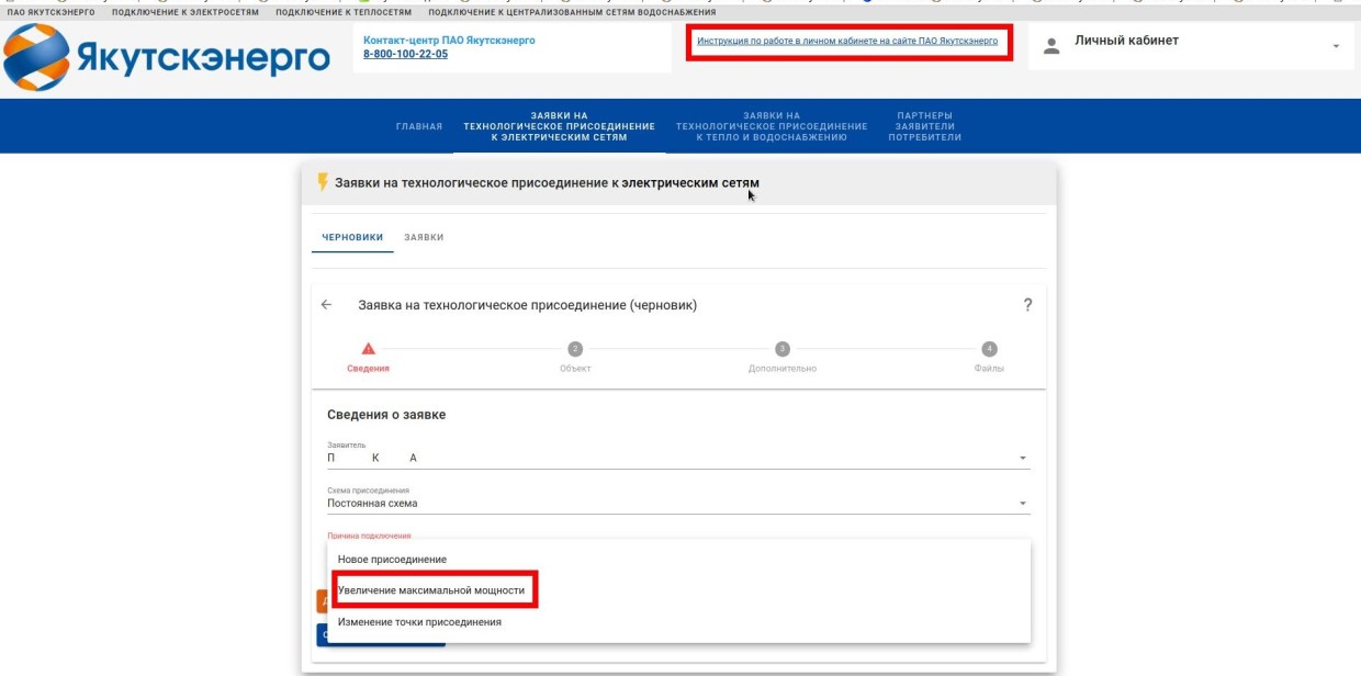 Сделать это удобно через Личный кабинет на сайте Якутскэнерго. В разделе «Заявка на технологическое присоединение» указываете тип устройств, заявителя, определяете схему присоединения и в графе «Причина подключения» выбираете вариант «Увеличение мощности». Подробная инструкция по работе в ЛК - всегда под рукой в верхней части экрана личного кабинета.