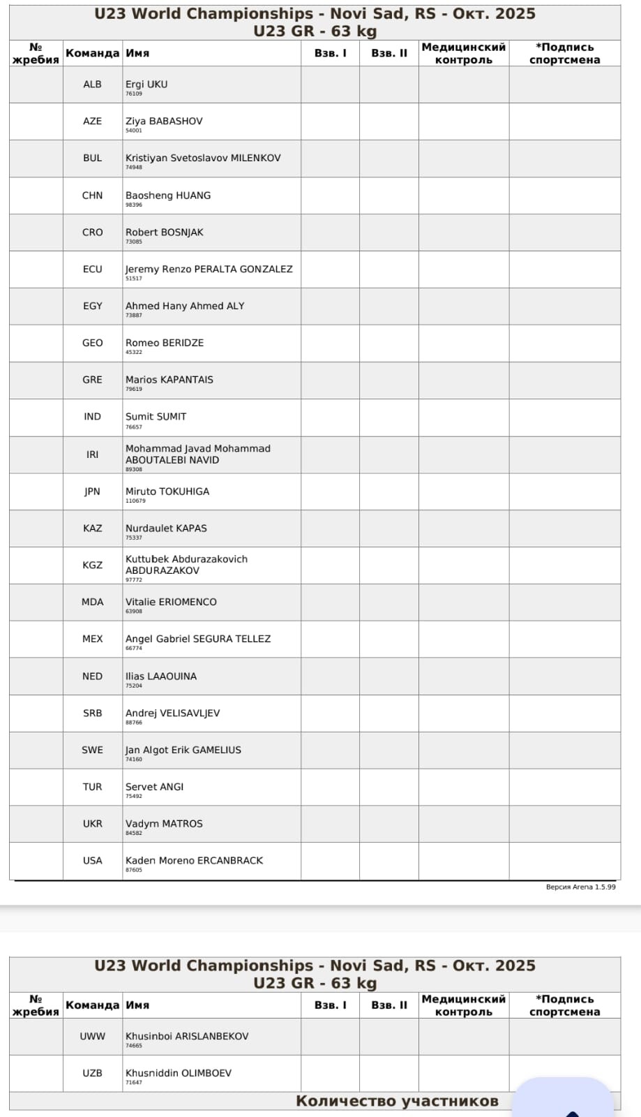 Между тем на официальном сайте Объединенного мира борьбы UWW обнародованы предварительные списки участников первенства. Это когда команды за полмесяца до состязания отправляют свои списки участников, которые на 90% будут бороться в Сербии.