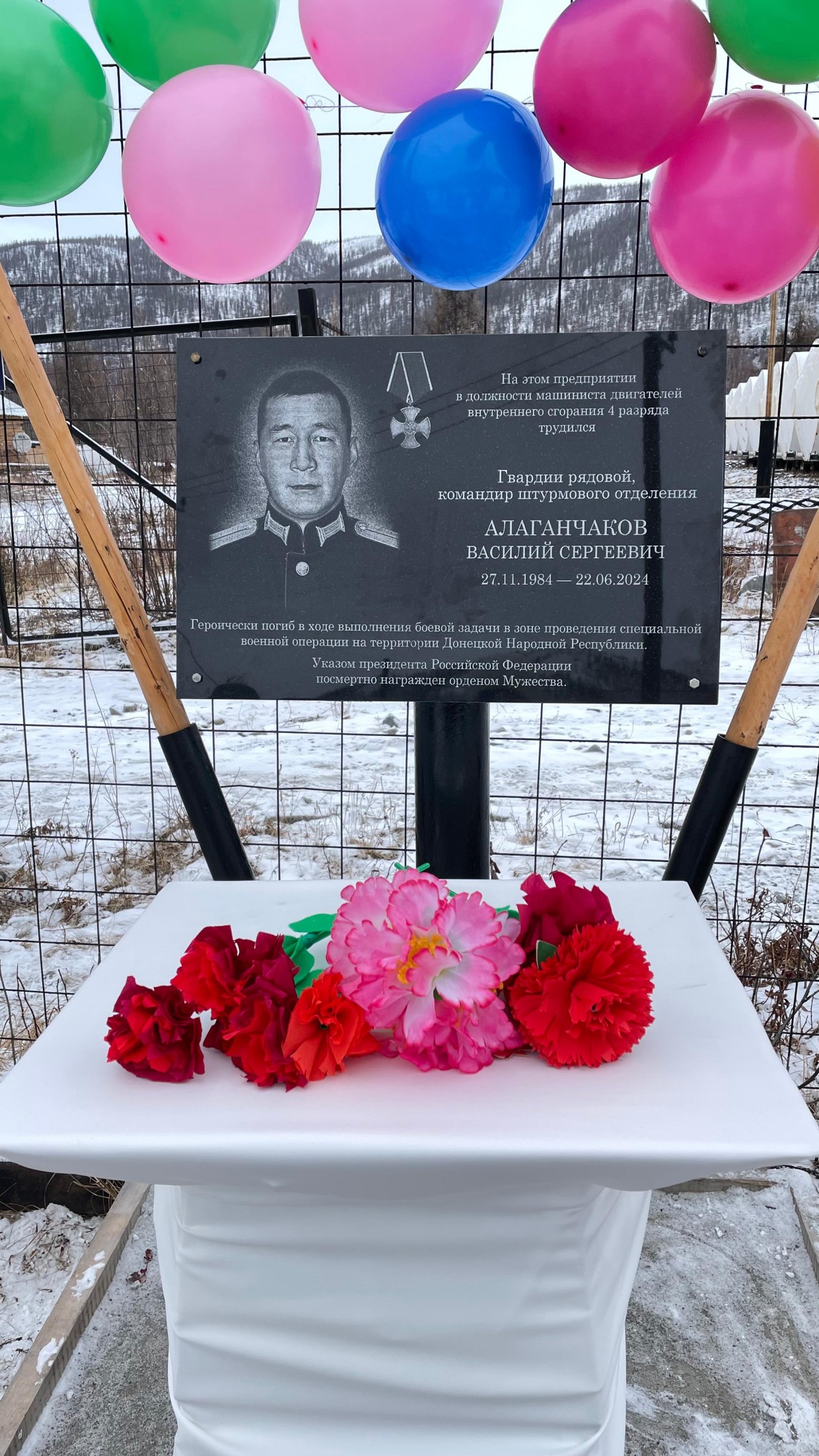 Мемориальную доску памяти гвардии рядового, командира штурмового отделения Василия Алаганчакова, героически погибшего в зоне проведения специальной военной операции, открыли энергетики Кобяйских электрических сетей АО «Сахаэнерго» (входит в ПАО «Якутскэнерго» Группы РусГидро).