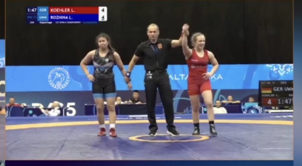Напомним, Л.Рожина вчера после досрочной победы над чемпионкой Болгарии Даниэлой Браснаровой, в четвертьфинале в равной борьбе проиграла двукратной чемпионке Азии до 23 лет, призеру Азиатских игр и чемпионата мира Нурзат Нуртаевой (она стоит на третьем месте во всемирном рейтинге UWW) из Кыргызстана со счётом 2:2.