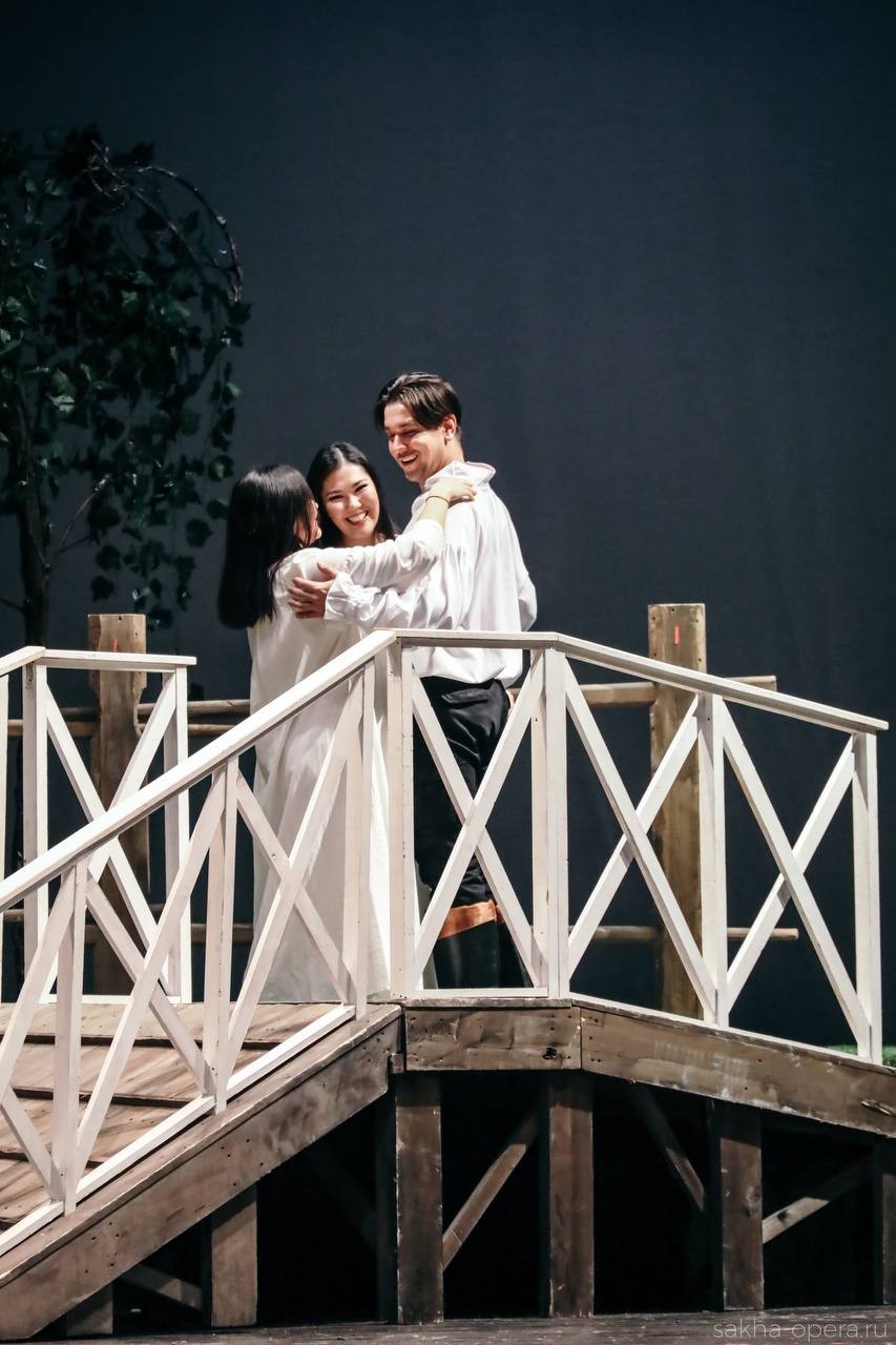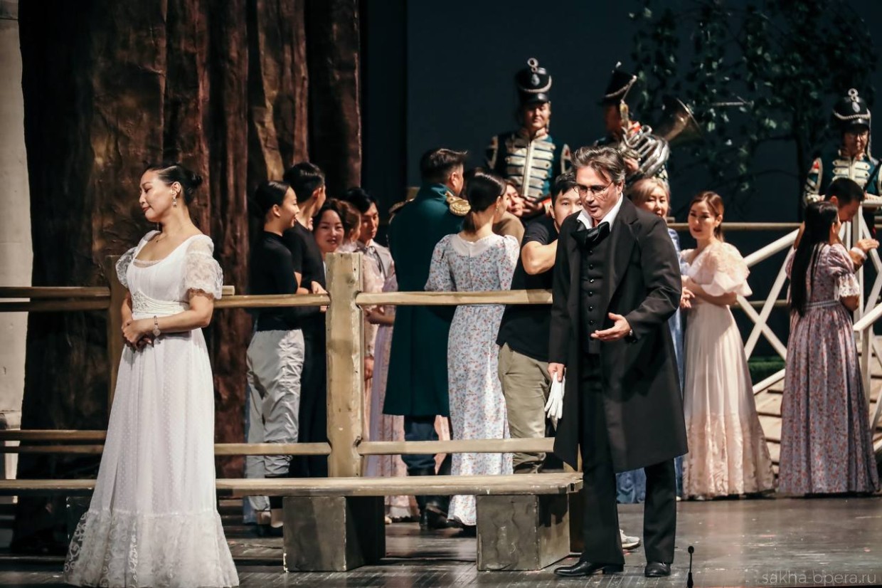 Постановка «Евгения Онегина» Карлом Сергучевым очень современна. Он сумел сделать это, не повредив музыкальное полотно, не отойдя от Чайковского и Пушкина. И даже Пушкина немного стало больше. Он нашел какие-то ходы, прочтение которых, например, образа Онегина, такого молодого, порывистого, может быть для некоторых несколько неожиданным. А передо мной стояла задача найти что-то такое, чтобы наш якутский зритель как бы вошел в этот спектакль, стал его частью. Поэтому появляется образ дерева. Оно же есть и в Михайловском. И мы смеялись, что нашли такую аналогию — заборы, какие есть и у нас, и в Михайловском.