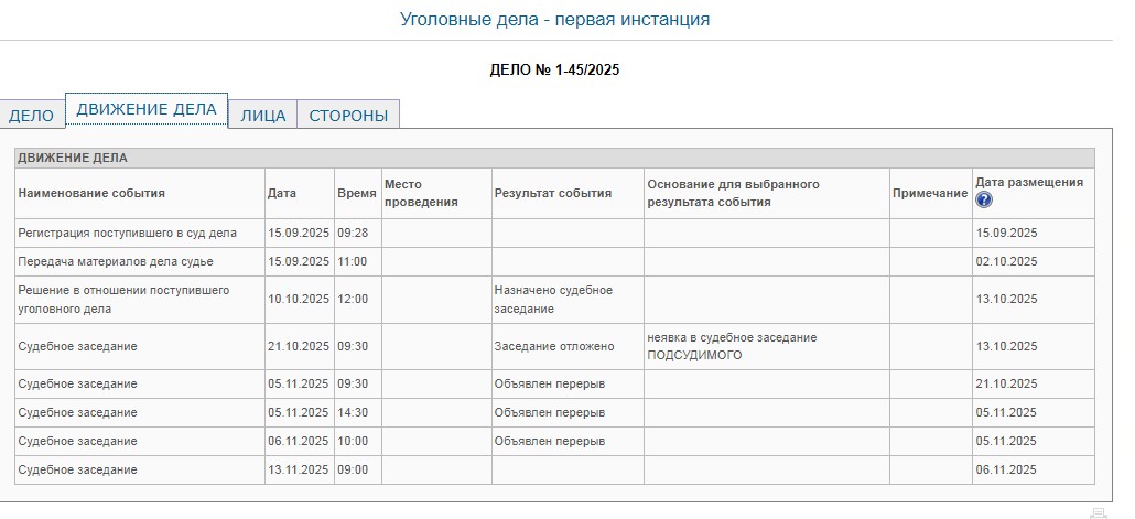 По данным на сайте суда, первое судебное заседание должно было состояться 21 октября, но заседание отложили по причине неявки подсудимого. Затем были назначены три заседания, на которых был объявлен перерыв. Последнее заседание назначено на 13 ноября.