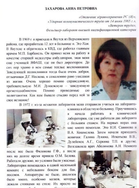 Всю свою жизнь Анна Петровна Захарова посвятила медицине. В 50-ые годы, окончив ЯФАШ (фельдшерско-акушерскую школу) в Якутске, в 1957 году уехала работать в Верхоянский район, и, проработав там в больничной лаборатории двенадцать лет в 1969 году вернулась в Якутск и пришла работать в Республиканский кожвендиспансер. Сначала работала медицинской сестрой, а потом фельдшером-лаборантом, была наставником для многих молодых специалистов. За без малого сорок лет работы Анна Петровна помогла вырастить многих специалистов лабораторной службы и снискала уважение и заслуженный авторитет у коллег. Дома Анну Петровну окружает любовью и заботой дружная семья – сын, дочь и двое внуков.