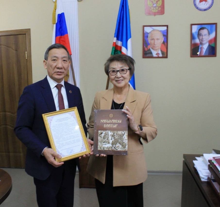 В завершении встречи Афанасий Иванович поздравил Анастасию Ивановну с Днём профсоюзного работника в РС(Я) и вручил приветственный адрес аппарату рескома и памятный подарок.
