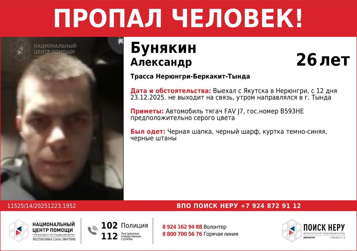 Александр Бунякин выехал из Якутска в Нерюнгри. С 12 часов дня 23 декабря не выходит на связь, утром направлялся в г.Тында (Амурская область).
