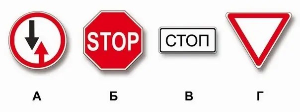 Комментарий: Только знак «Б» - 2.5 «Движение без остановки запрещено» - требует обязательной остановки. Знак устанавливается или у пересечения проезжих частей (случай 1), или у ж. д. переезда, или карантинного поста (случай 2). Знак «А» - 2.6 «Преимущество встречного движения» - запрещает въезд на узкий участок дороги, если это может затруднить встречное движение. Знак «В» - 6.16 «Стоп-линия» – обозначает место остановки транспортных средств при запрещающем сигнале светофора на перекрёстках или запрещении проезда через ж/д переезд. Знак «Г» - 2.4 «Уступите дорогу» - определяет очерёдность проезда конкретного пересечения. Место остановки при необходимости выбирайте сами, руководствуясь правилом: «Вы не должны возобновлять или продолжать движение, осуществлять какой-либо маневр, если действие Вашего автомобиля вынудит других участников движения изменить направление движения или скорость». («Дорожные знаки»)