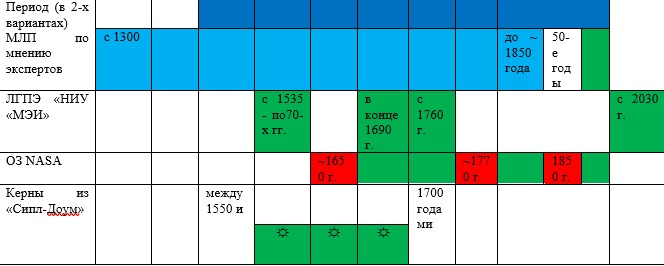 Светло-синим и тёмно-синим цветами выделены 2 (два) варианта периодов МЛП, по мнению экспертов и ученых, зеленым периоды потепления, красным три максимума, разделенных периодами тепла. Матрица разработана как гипотеза ФНД.