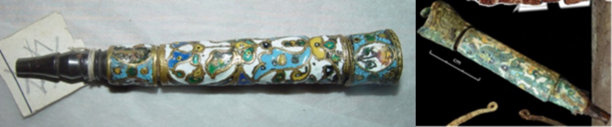 Оба (Сольвычегодское и Великого Устюга) направления работ с эмалью имели взаимопроникающее искусство, где с переходом к друг другу мастеров перенимались и многие художественные приемы, техника и способы нанесения эмали. Так, совсем недавно «В Якутске археологи обнаружили [ножи, но]… Ножи не рядовые, указан высокий статус их владельца. Такие ножи использовались в 16-18 веках. Рукоятка одного из них богато украшена растительным декором. Представляет собой… …высокое художественное произведение», - отметил, руководитель Сургутского ОП НПО «Северная археология-1» [10.1].