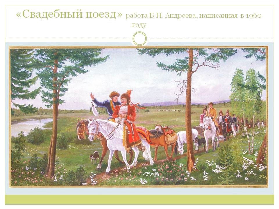 Примером подобного творчества является следующая картина: История создания картины «Кийиит сүктэн барыыта» («Свадебный поезд») связана с историческим фактом из книги С.А. Токарева «История Якутии» 1957 г. о том, что человек по прозвищу Тарагай Болтоно со своими сородичами отказались платить ясак. Представитель власти, приближенный царя Мазары Бозеков… …добравшись до Тарагая Болтоно Мазары Бозеков, увидев дочь Тарагая Болтоно – девушку невиданной красоты по имени Чомогор, решил взять ее в жены, пообещав походатайствовать за родных невесты перед власть имущими. На картине видна красивая, счастливая невеста, гордая и довольная тем, что спасает отца и сородичей от жестокого наказания [28].