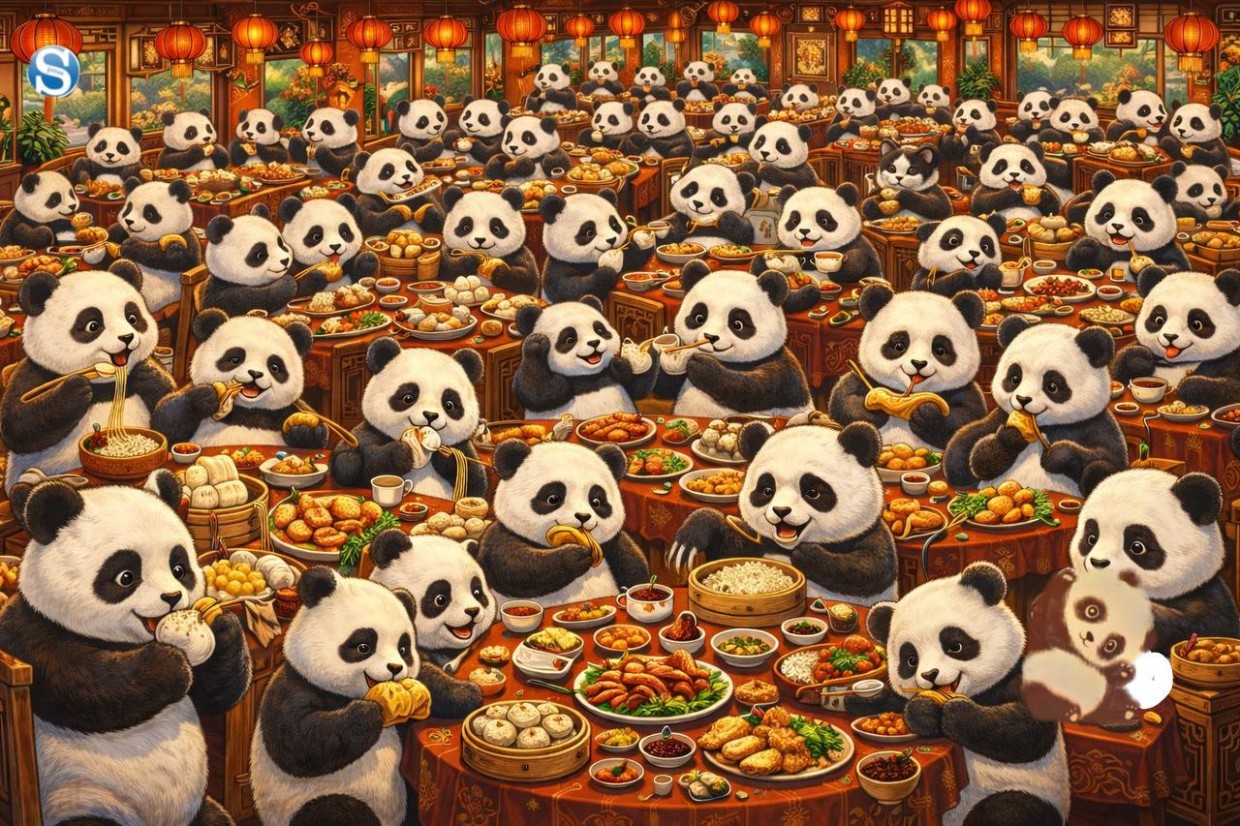 Задание: Перед вами уютная сцена в китайском ресторане: за столиками мирно ужинают панды в традиционных нарядах. Они едят палочками, пьют чай и общаются.