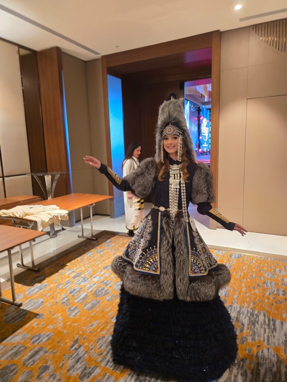- Конкурсы включали выходы в национальном костюме, спортивный выход и выход в вечернем платье. Спортивный выход Арины с флагом Якутии – это вам ещё в Якутске подсказали?
