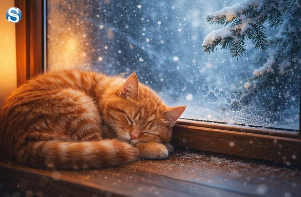 Задание: Перед вами на картинке пушистая кошка крепко спит, свернувшись клубочком на подоконнике у окна. За окном — безмятежно падает мягкий. Однако в этой идиллической сцене есть одна ошибка, допущенная художником Sakhapress.