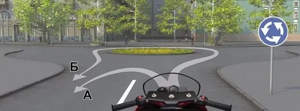 Движение на перекрёстке, обозначенном знаком 4.3 «Круговое движение», организовано по кругу в направлении стрелок. Траектория «А» проходит во встречном направлении, что недопустимо. Для разворота следует выехать на перекрёсток и совершить «круг почета». Разворот можно совершить только по траектории «Б». («Дорожные знаки»)