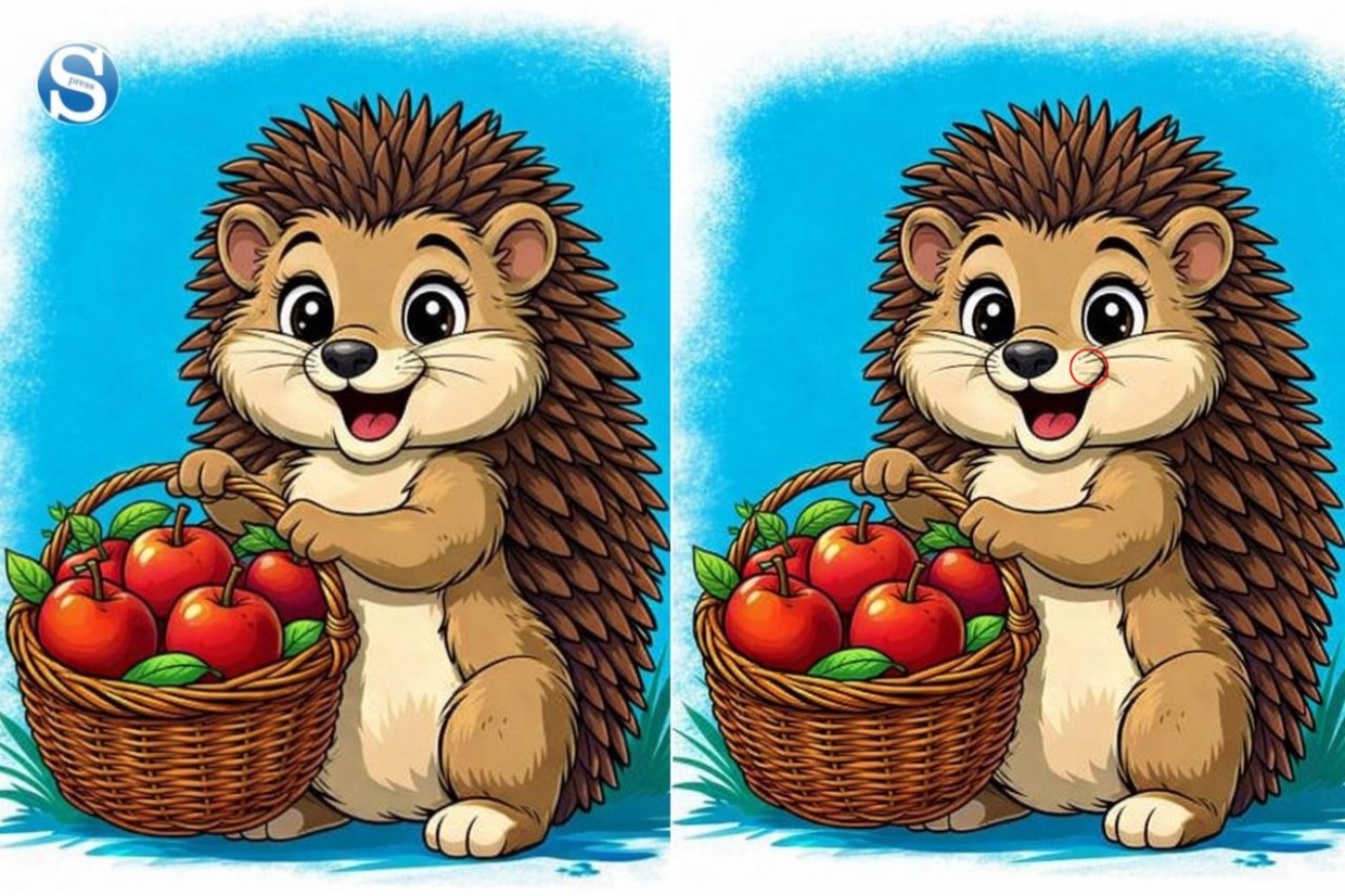 Головоломка «Ежик с корзинкой яблок»: Найдите одно отличие на картинках за 10 секунд