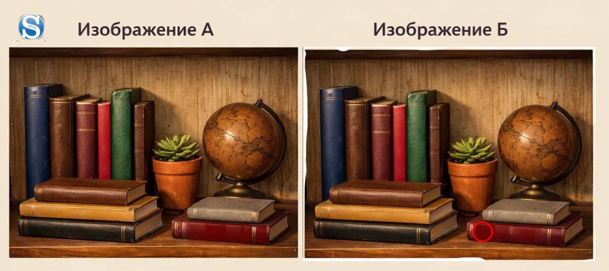 На первый взгляд, перед вами два одинаковых снимка уютной книжной полки. Книги стоят ровными рядами, корешки радуют глаз разноцветием, и даже лёгкий беспорядок кажется идентичным. Но не торопитесь закрывать страницу — здесь есть одно отличие, и ваша задача его найти.