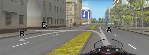 Знак 6.3.1 «Место для разворота» запрещает поворот налево для всех видов транспортных средств. Из указанных направлений нельзя продолжать движение по траектории «Б». Вам разрешено движение по траектории «А» или «В». («Дорожные знаки»).